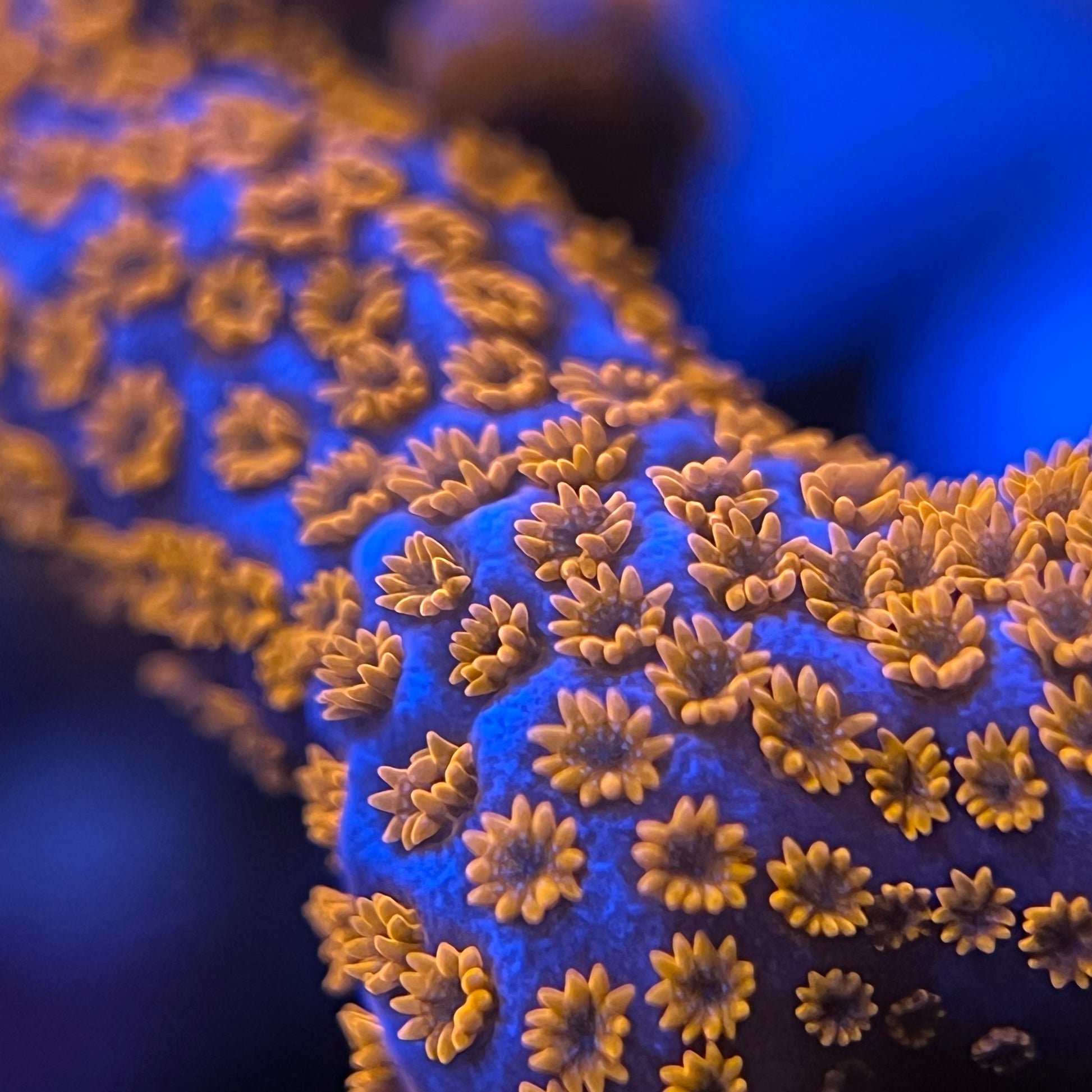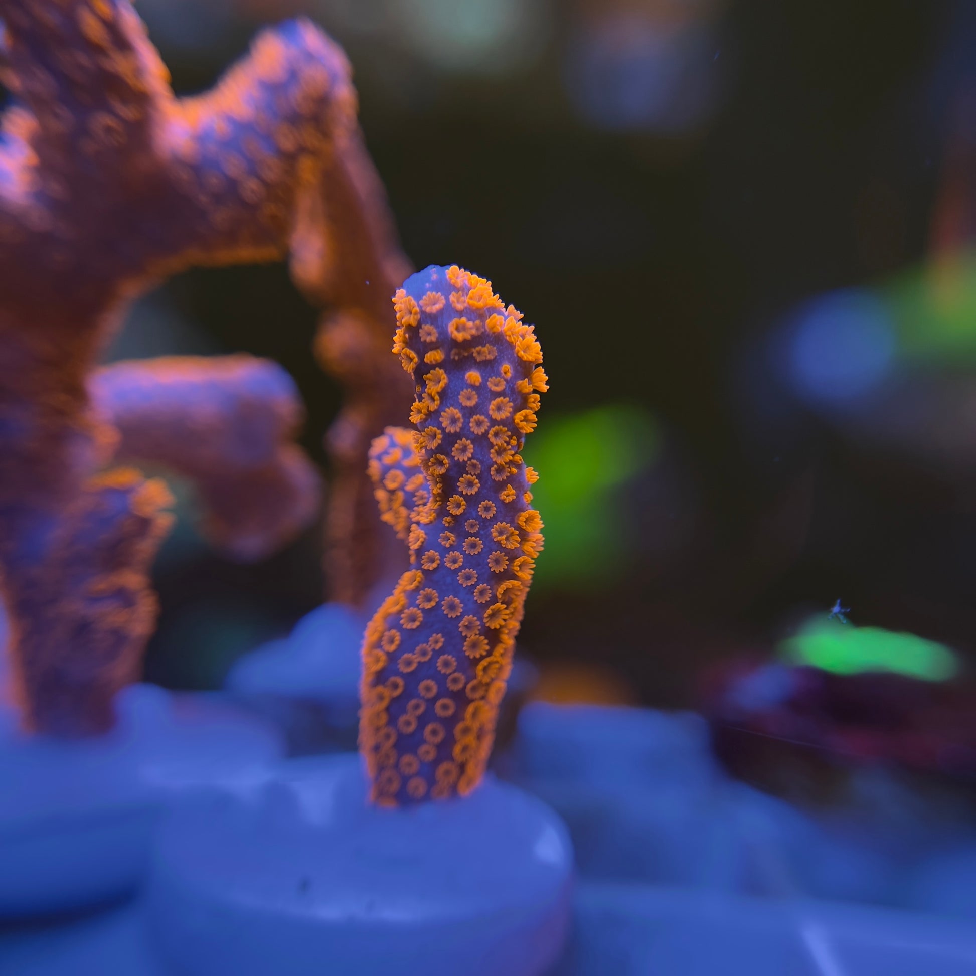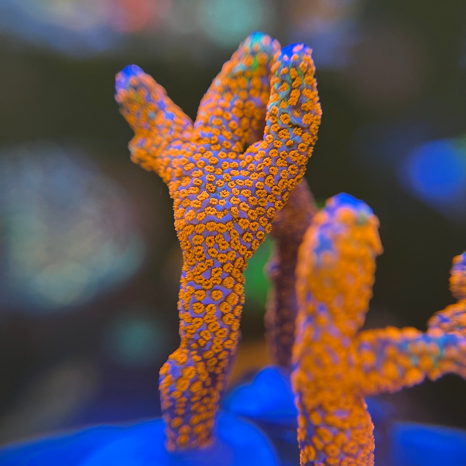 The Forest Fire Digitata is one of the most sought-after Montipora varieties, prized for its fiery red-orange branchescontrasted by bright blueish-green polyps. This unique color combination creates the illusion of a forest ablaze, making it a true showpiece in any SPS or mixed reef system. Fast-growing and hardy, it’s a great choice for reefers looking to add both color and structure.