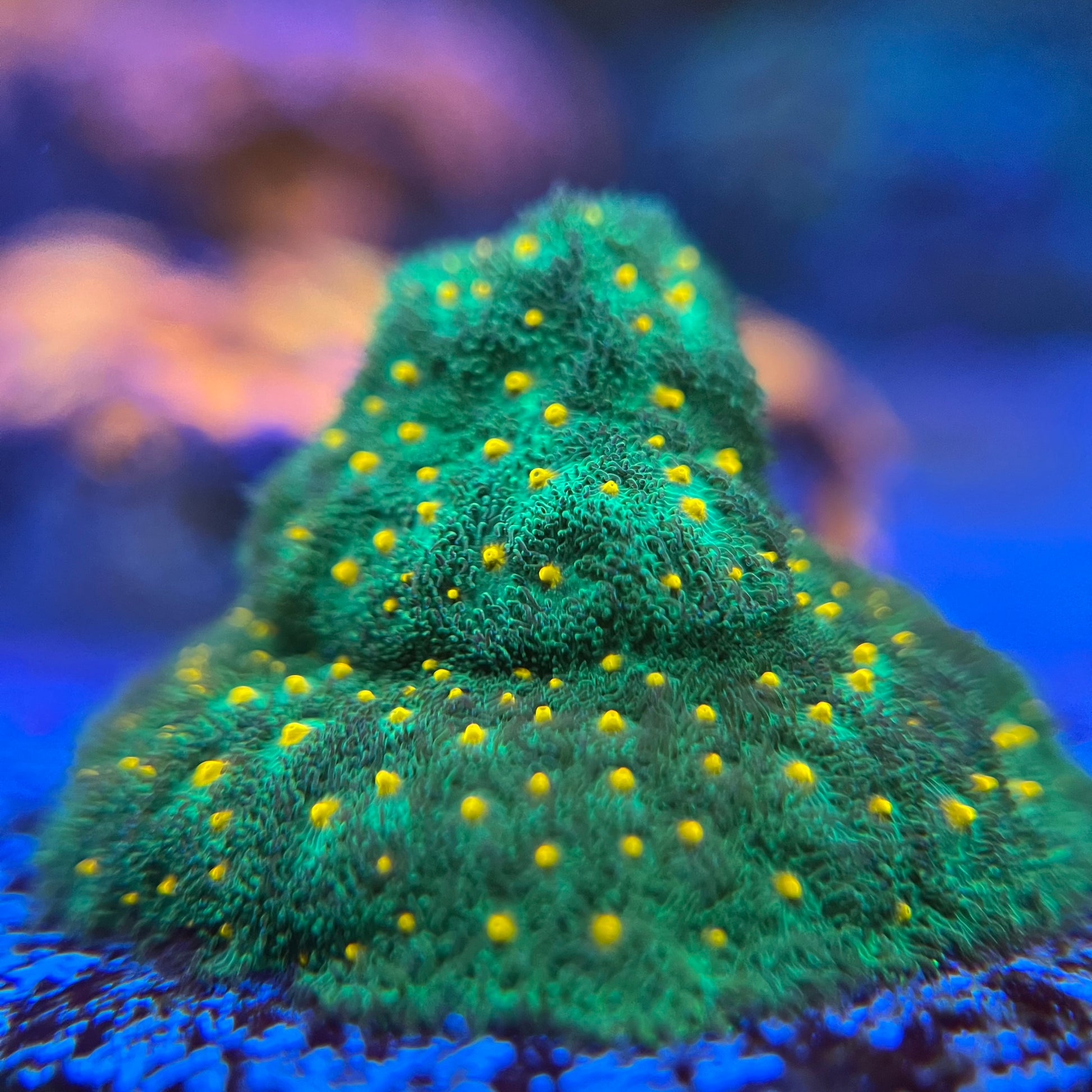 The John Deere Psammacora is a striking encrusting SPS coral known for its bright green base covered in contrasting orange to red polyps. This bold color combo gives it the classic John Deere look, making it a favorite for collectors and reefers who want a hardy, colorful coral that stands out. Its encrusting growth form makes it perfect for covering rockwork, plugs, or even reef structures with a vibrant carpet of color.
