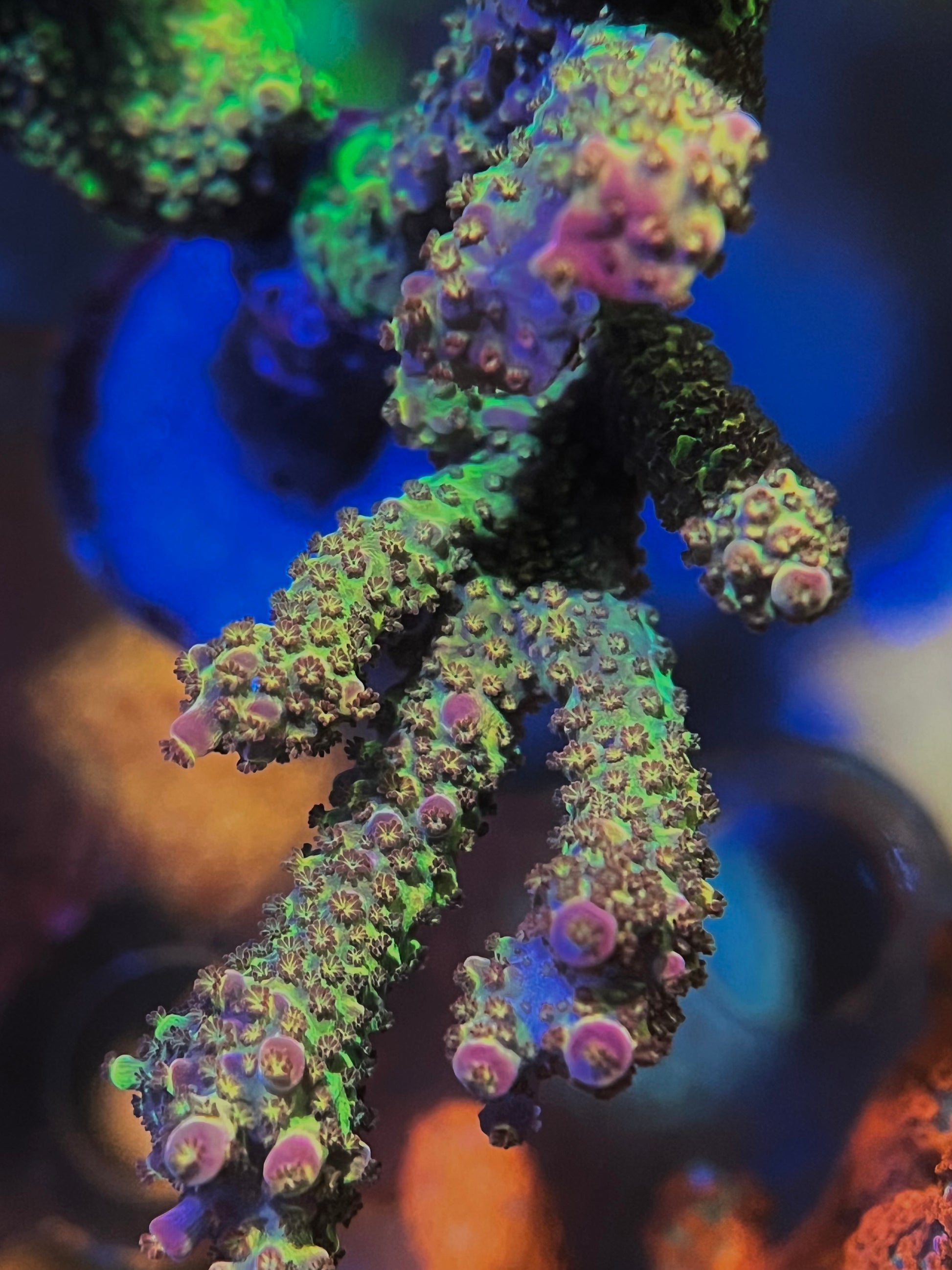 The PC Rainbow Acropora is a spectacular SPS coral prized for its vibrant rainbow hues and intricate branching structure. Each frag displays a kaleidoscope of colors—pinks, purples, blues, and greens—that truly pop under reef lighting. This fast-growing coral thrives under strong light and moderate to high water flow, making it a favorite for experienced aquarists looking to create a dynamic, colorful reef display.