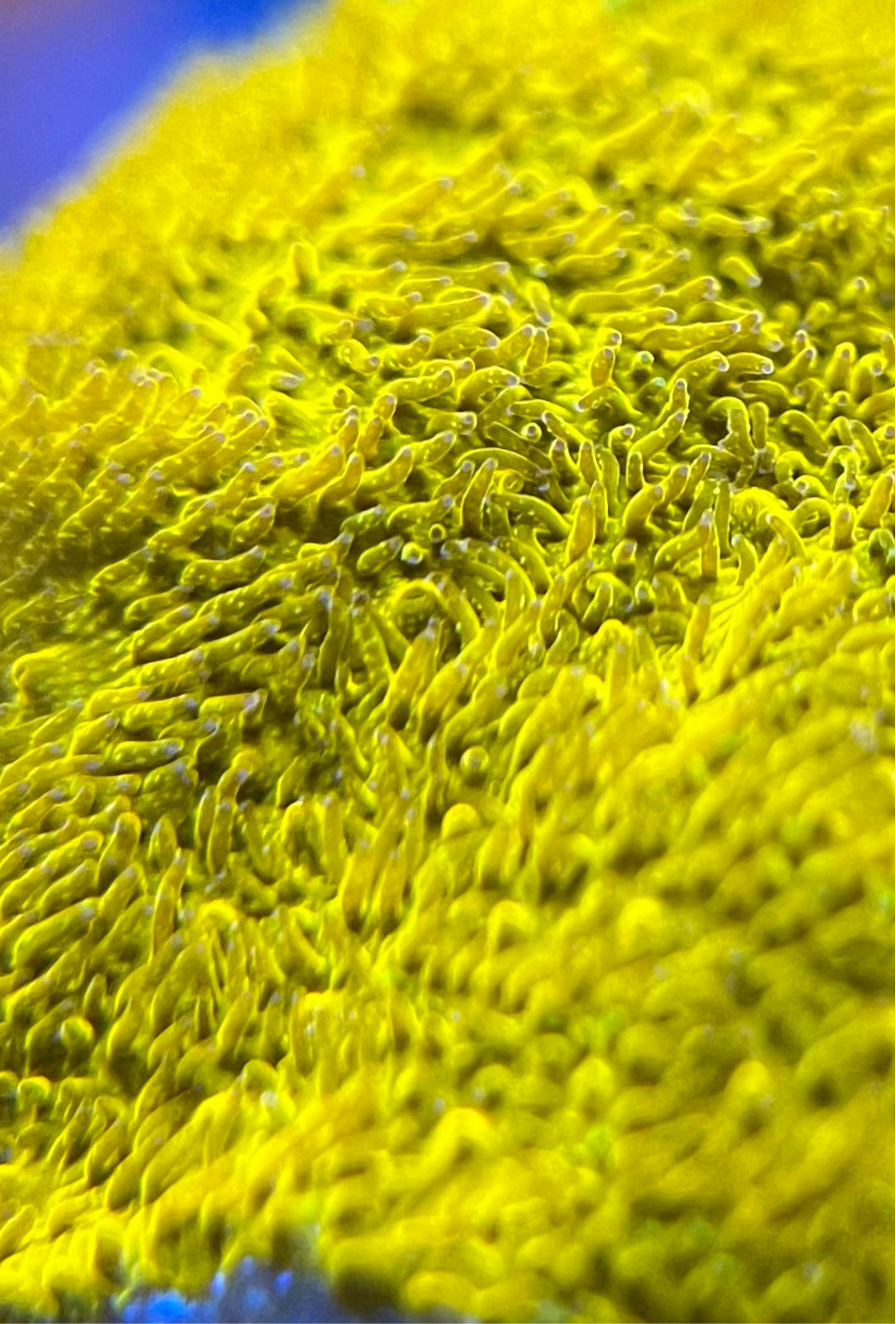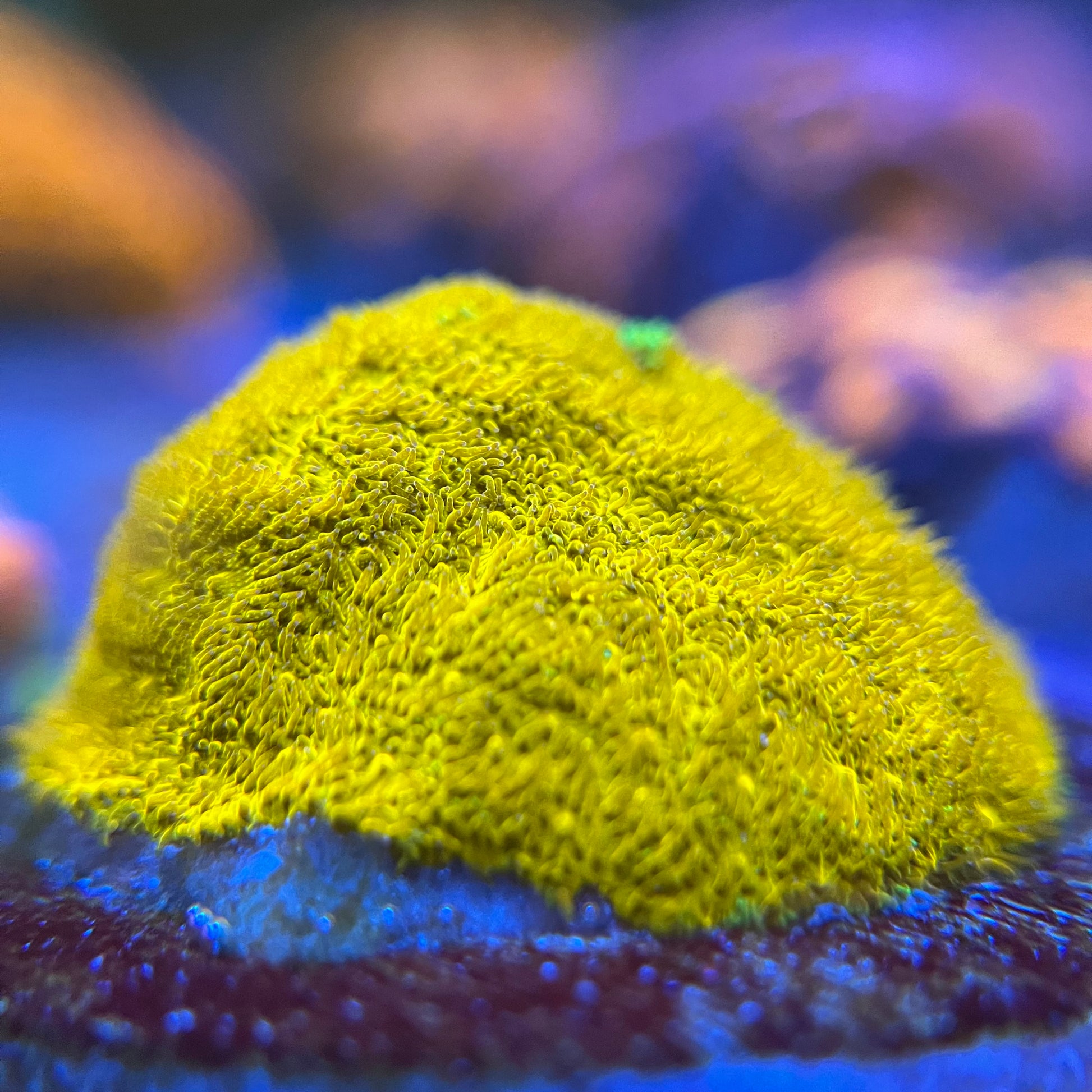 The Watermelon Psammocora has a two tone orange and green coloration that develops a spectacular bright green growth edge. Psammocora are a relatively uncommon and under appreciated small polyp stony coral.